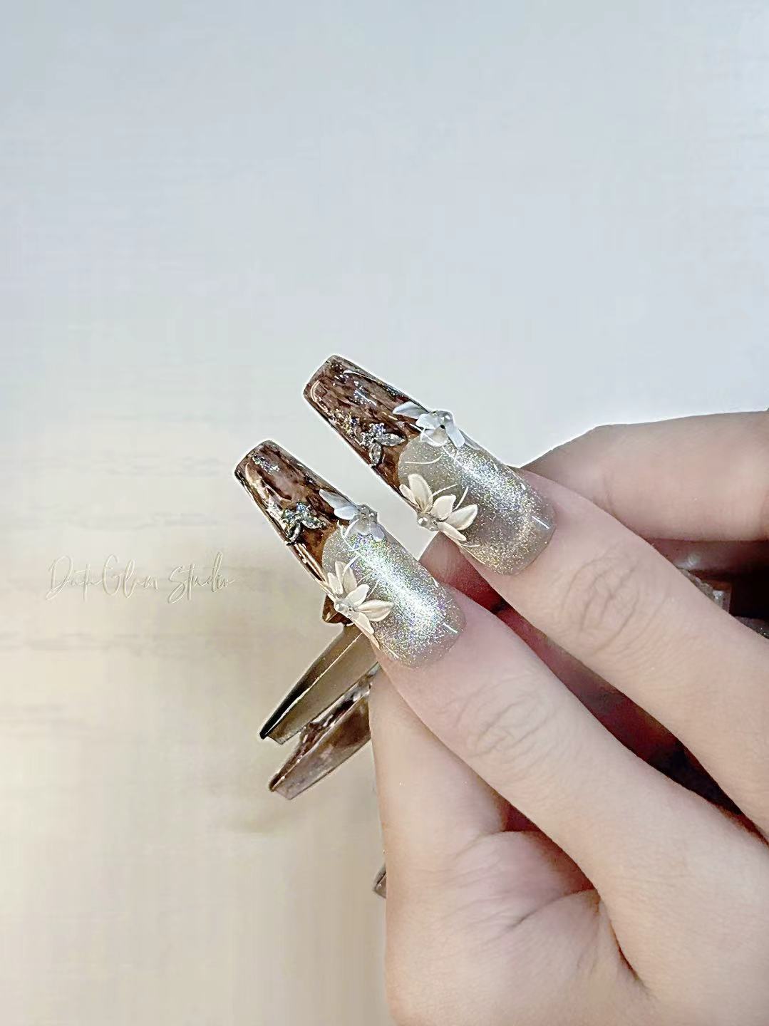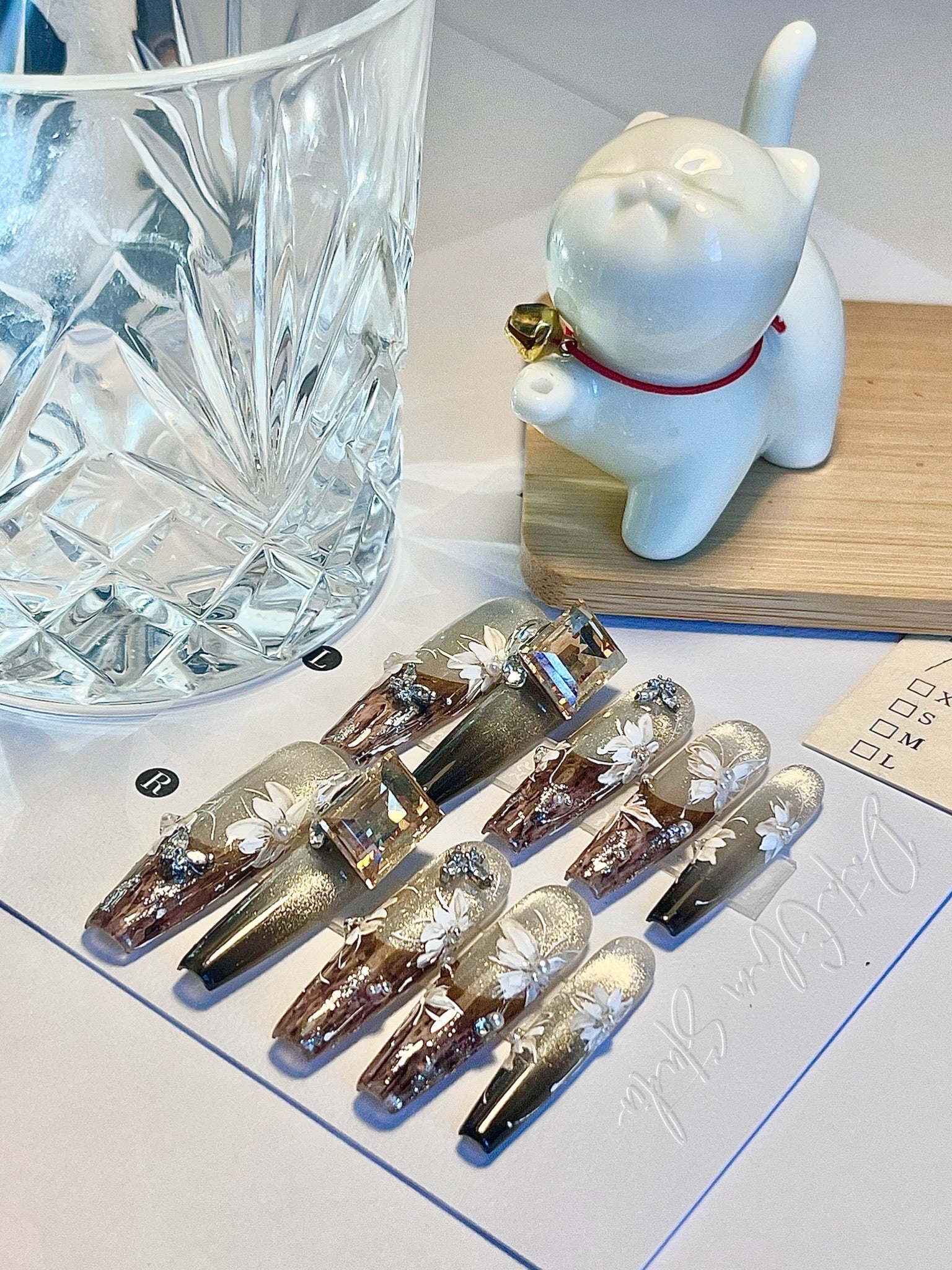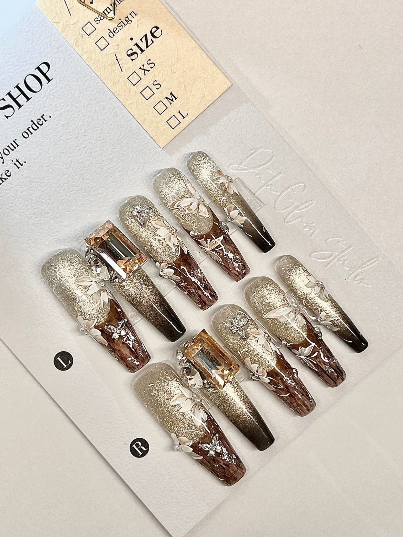 Gilded Root entwines earthy espresso tones with brushed champagne shimmer, anchoring hand-sculpted florals in warmth and richness. Crystalline accents glint like dew over soil, while the gradient fade evokes twilight grounding into night.