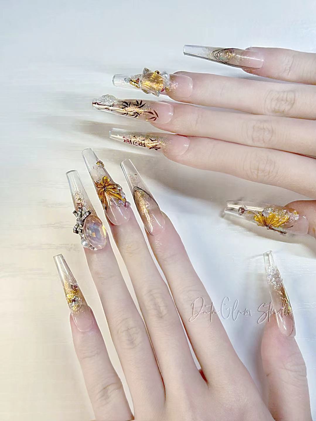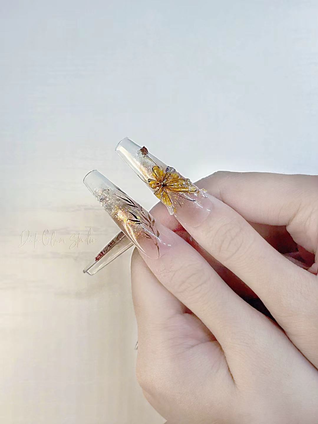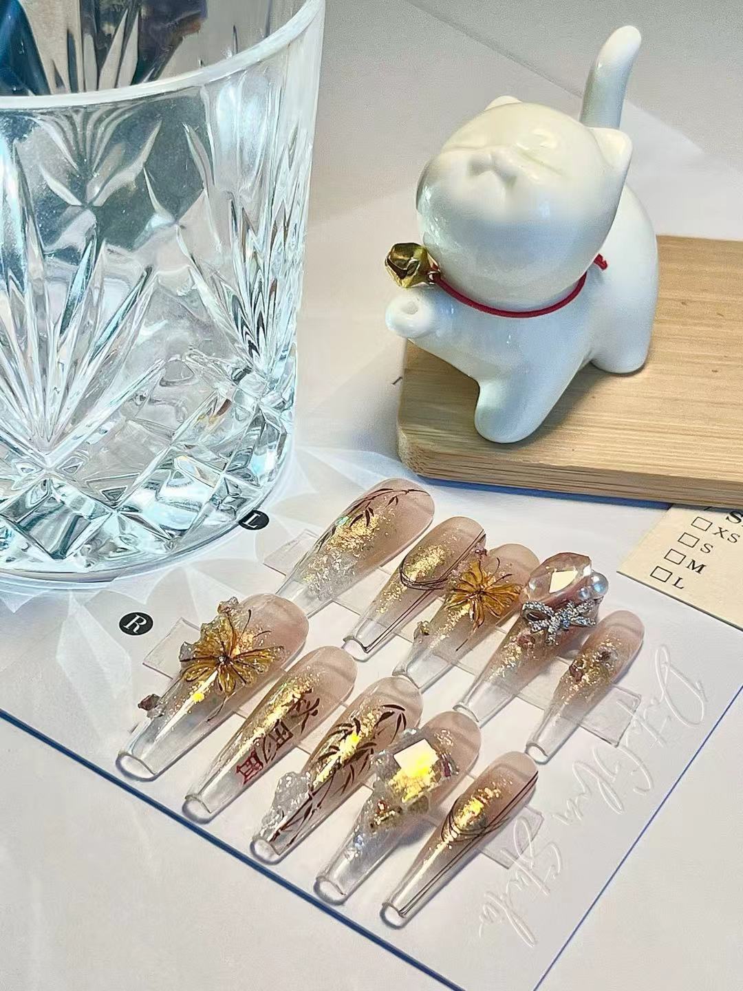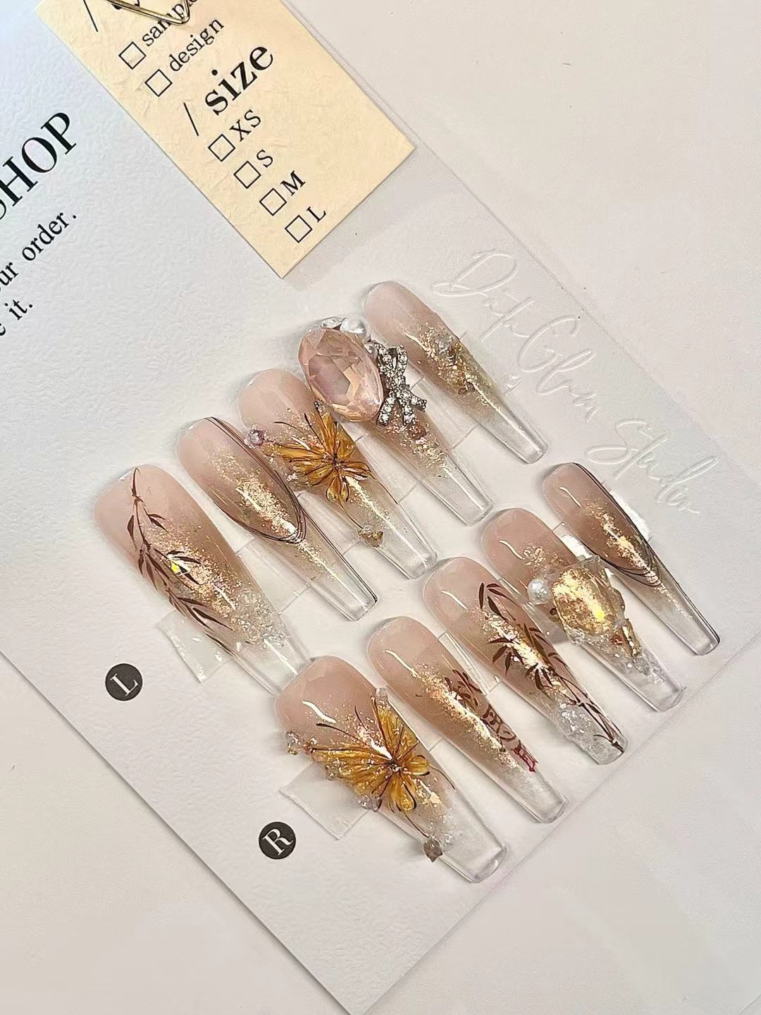 Golden Hour Bloom captures the richest moment of the day, blending warm blush bases with radiant gold foils and sunlit florals. Amber-gilded butterflies flutter across tips, while sculpted gems and delicate glazes catch light like late August skies.