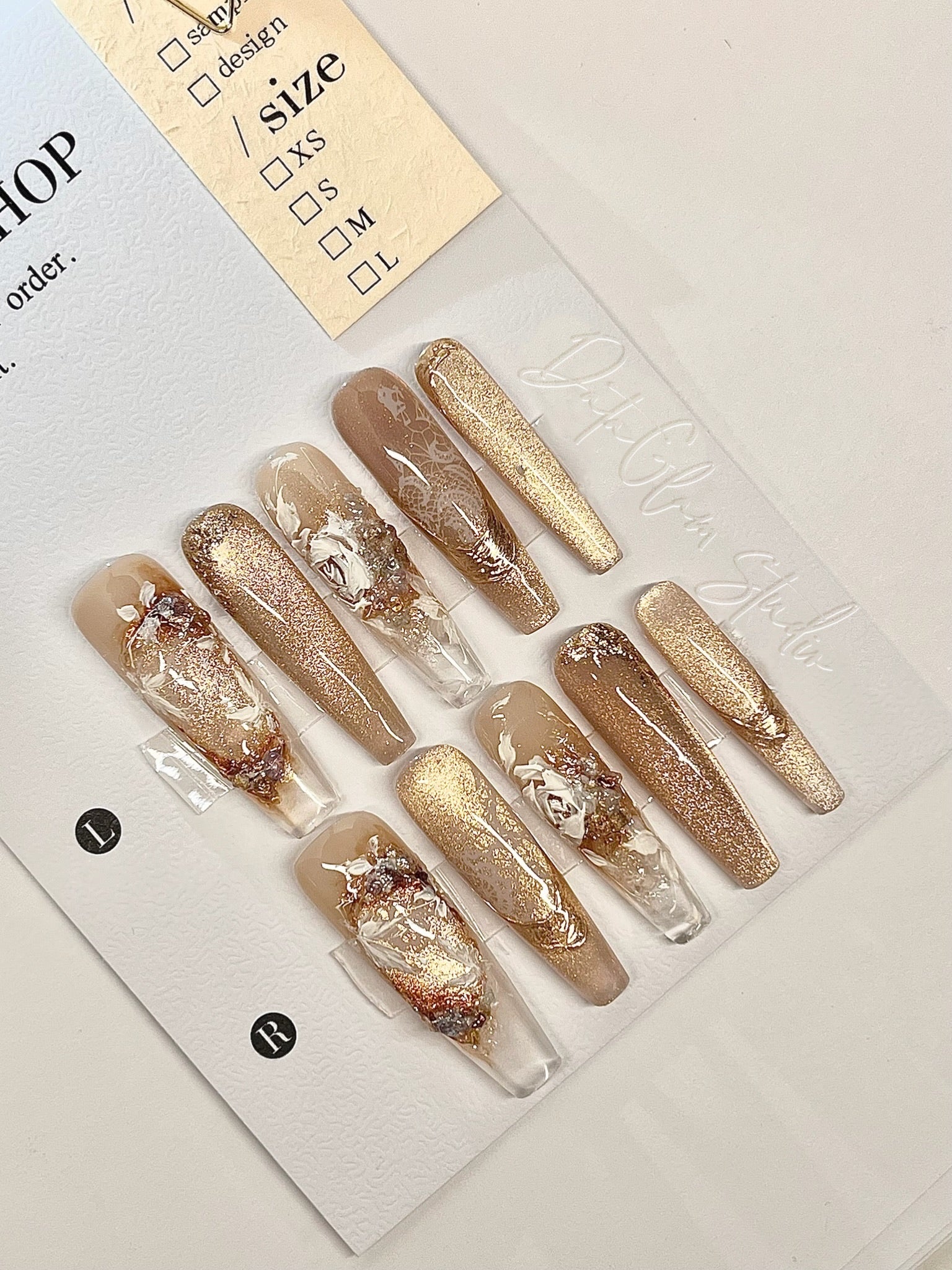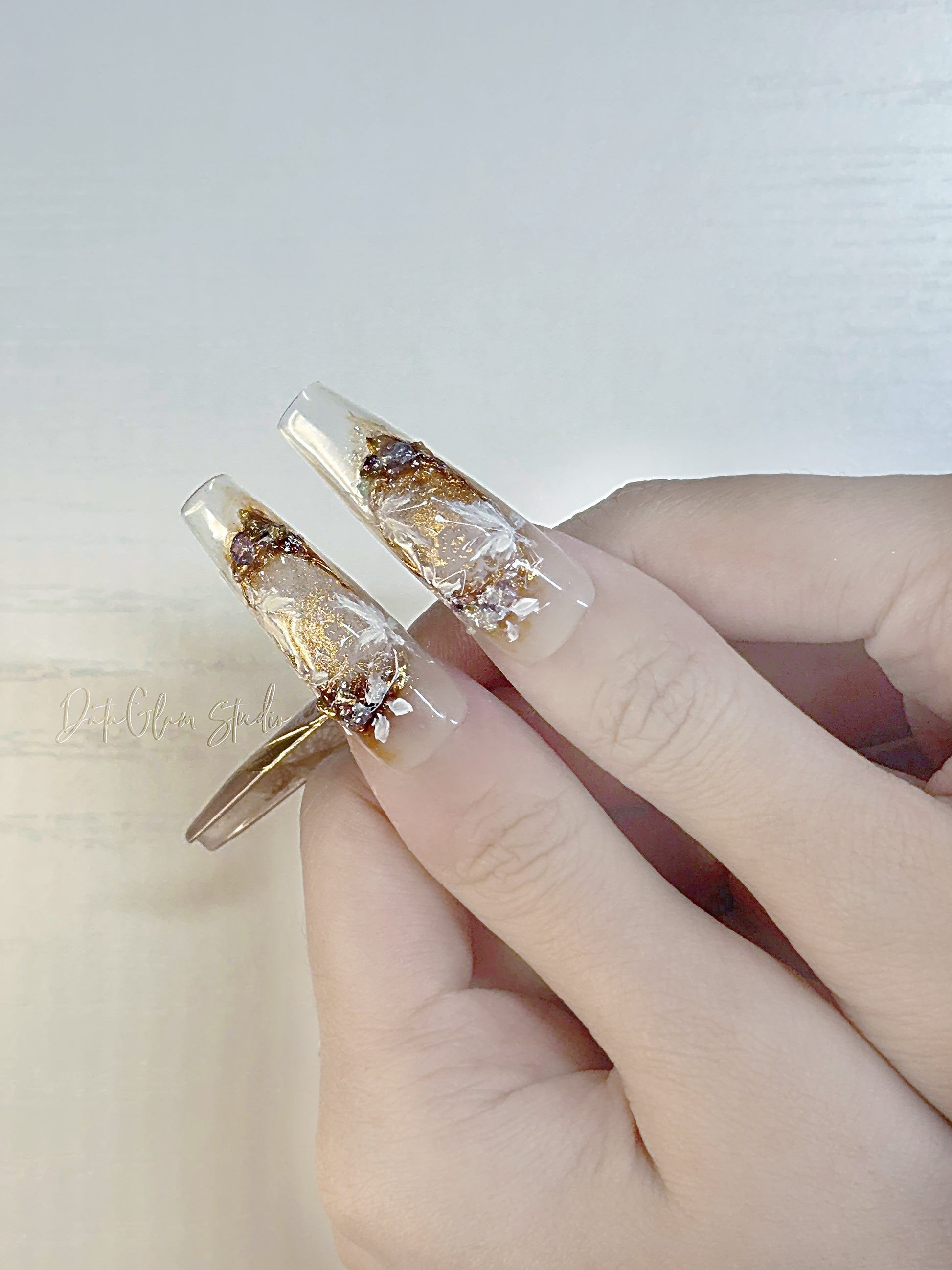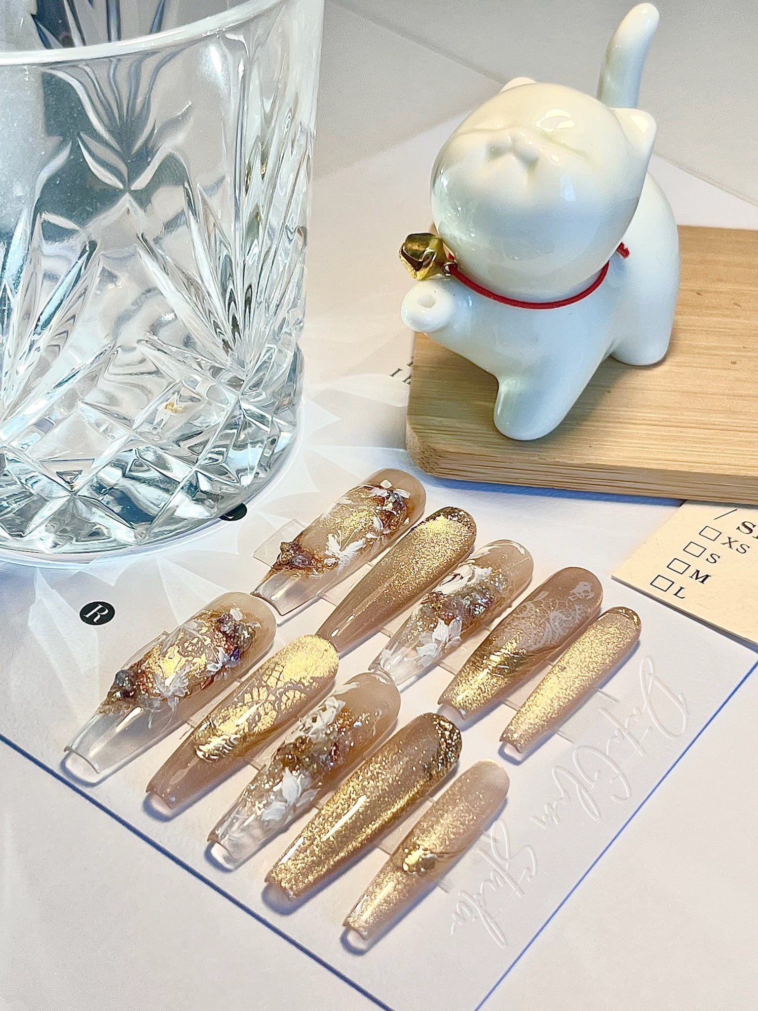 Golden Mirage is a radiant blend of champagne gold and warm beige, layered with hand-painted white florals and flecks of copper foil that flicker like mirages on the horizon. Clear tips and abstract sculpted accents reflect light like glints off crystal sands.