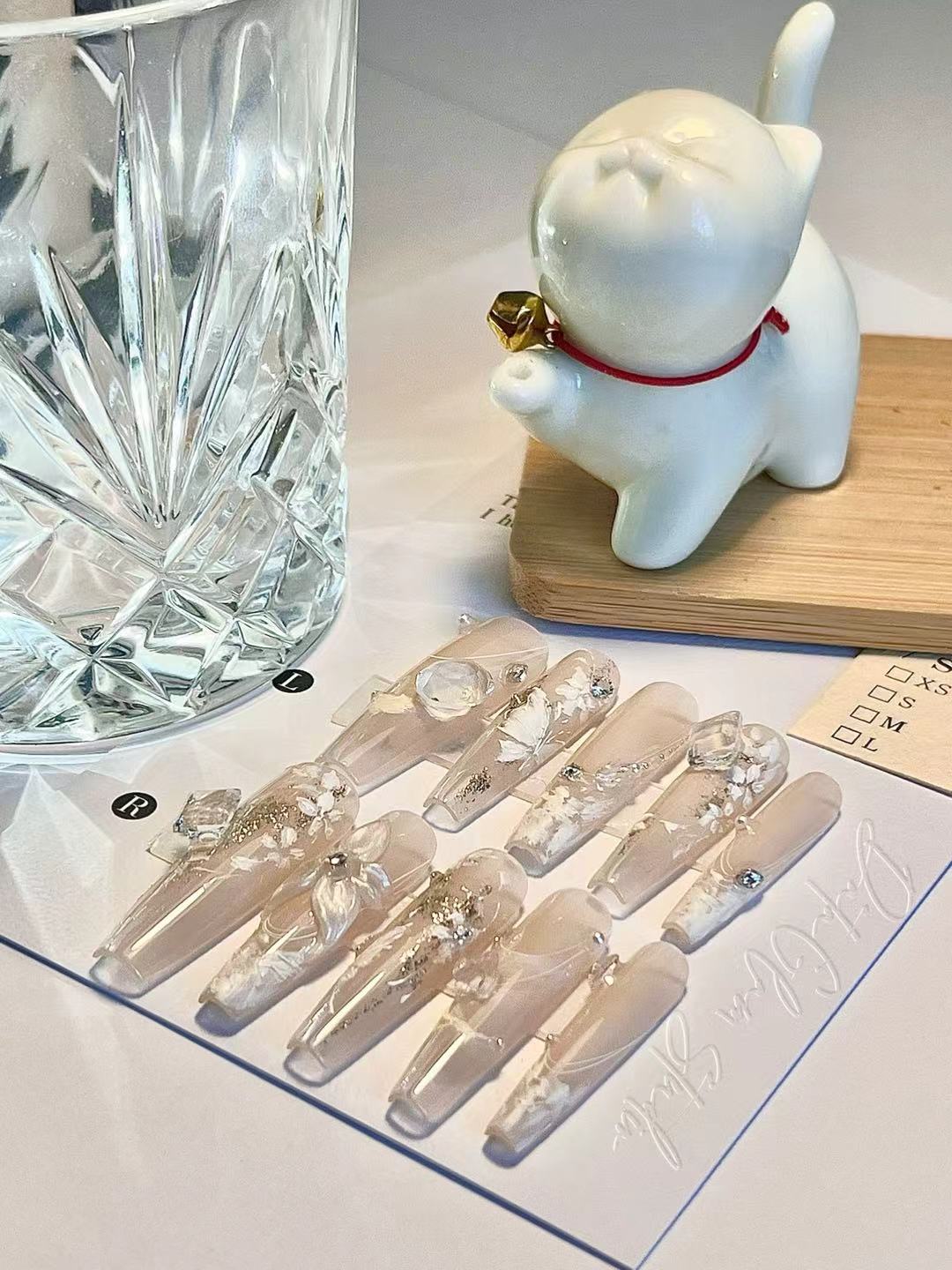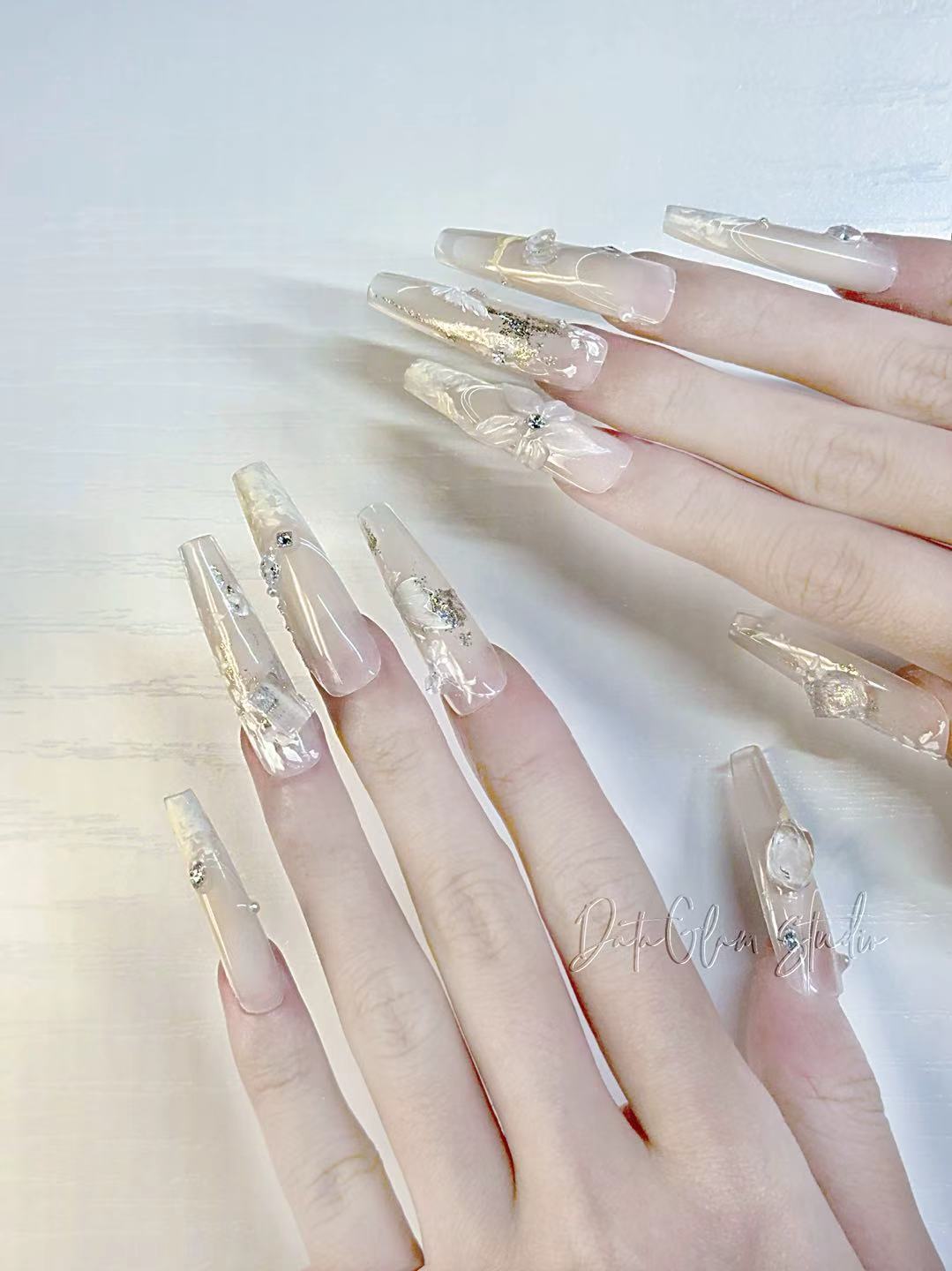 Milkglass Petals captures the hush of summer mornings: translucent nude bases bathed in soft gold dust, sculpted flowers that bloom midair, and glints of crystal catching the light like dew. Each design feels hand-blown — delicate, airy, and impossibly refined.