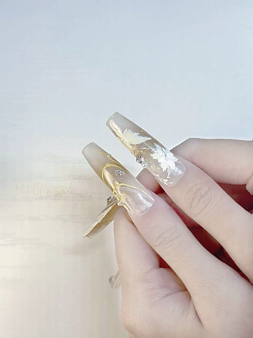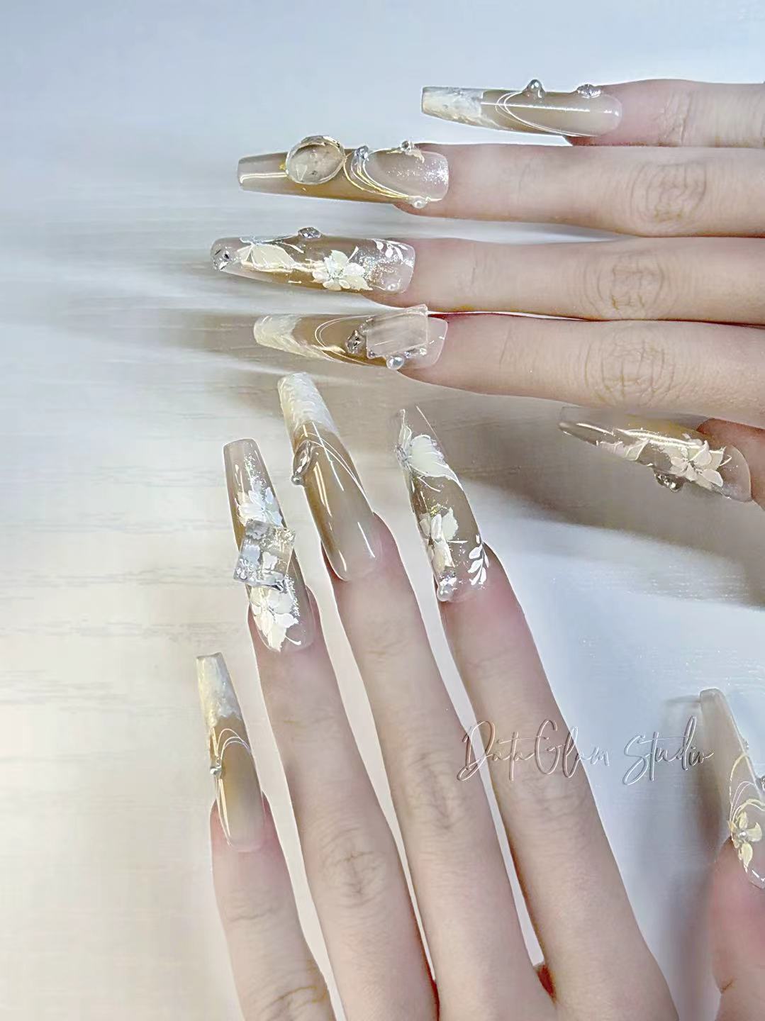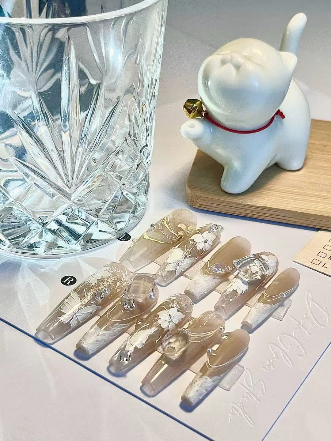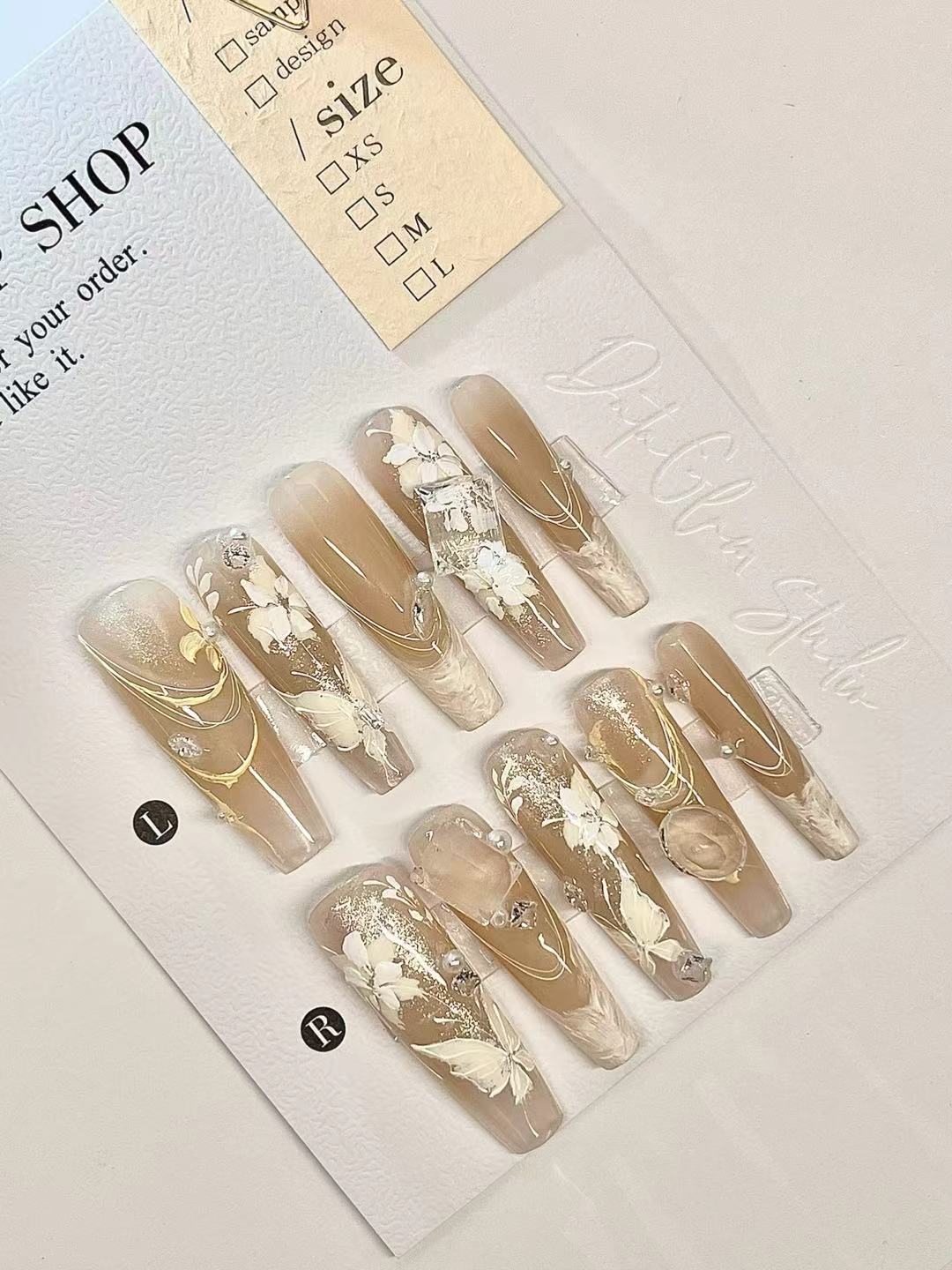 Silken Nectar captures that golden hour softness: warm beige blends into cream with the luster of silk, adorned with painted florals and glints of golden dust like pollen suspended in light.